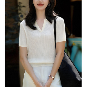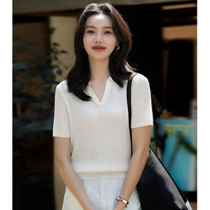 设计感小众翻领短袖白色针织衫女2025年夏季新款气质通勤别致上衣