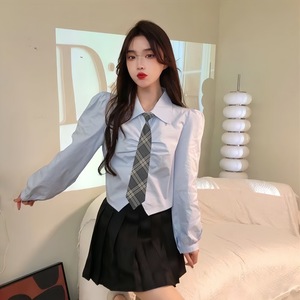 学院风蓝色衬衫女春秋新款长袖衬衣纯欲百搭设计感上衣jk制服套装