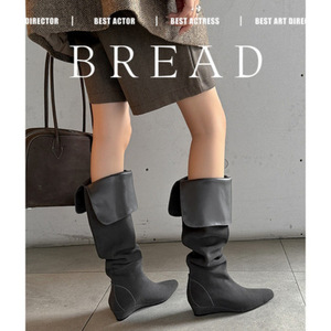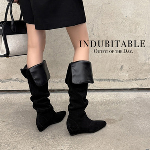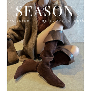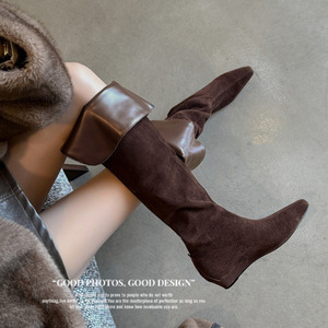 2025秋冬新款复古内增高长筒靴尖头高筒靴女绒面大筒围褶皱堆堆靴