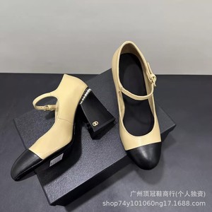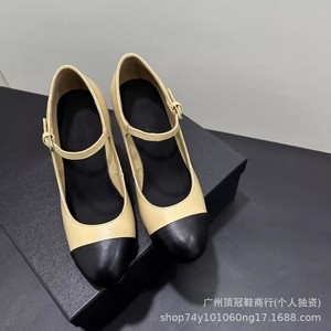 2025年春夏新款小香风拼色网纱蕾丝一字扣带粗跟圆头百搭单鞋女