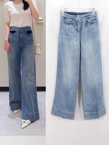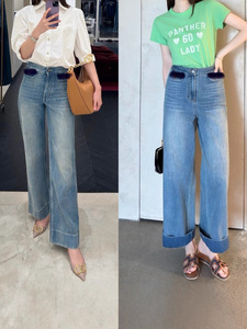 高版本Vn前贴袋蓝色直筒牛仔裤女款阔腿翻边垂感百搭2025秋冬款
