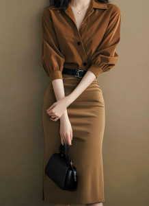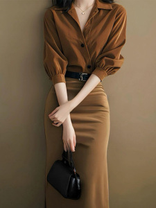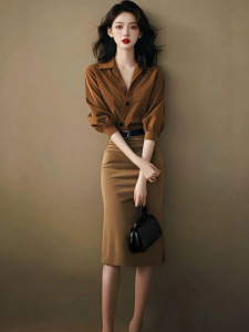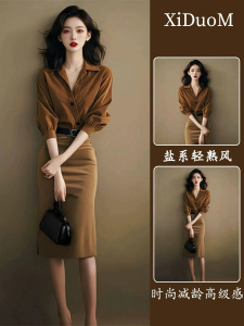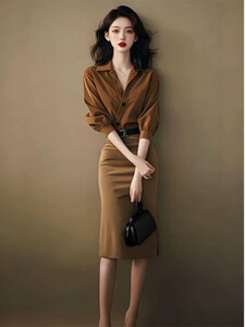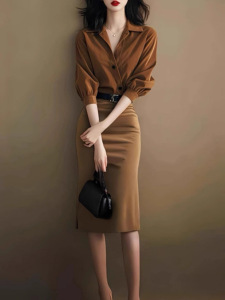 早秋季气质穿搭轻奢高级感又a又飒炸街时尚咖色半身裙两件套装女