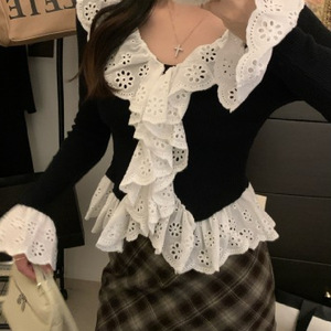 2025新款法式撞色拼接蕾丝花边喇叭袖显瘦V领法式别致内搭上衣女