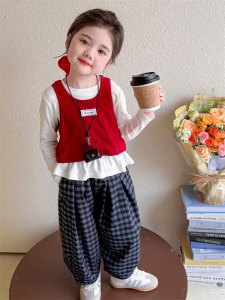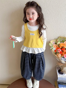 小女孩韩系格子裤三件套秋款儿童女宝宝时髦洋气马甲打底衫套装潮