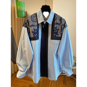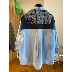 2025春秋新款高级感宽松休闲复古民族风印花蓝色条纹长袖衬衫女装
