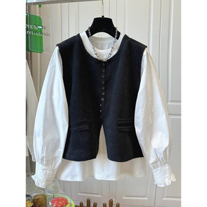 高级感灰色针织马甲开衫长袖衬衫女两件套宽松休闲时尚套装秋新款