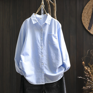 纯棉灰色条纹衬衫女长袖小个子春季新款宽松休闲内搭叠穿打底衬衣