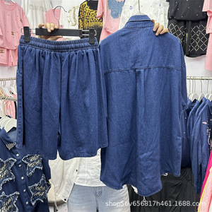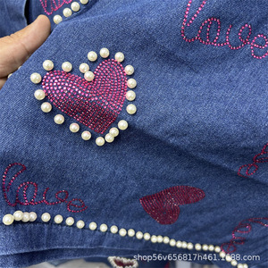 欧美重工烫钻爱心宽松短袖牛仔衬衫上衣+松紧腰阔腿短裤两件套女
