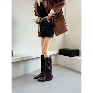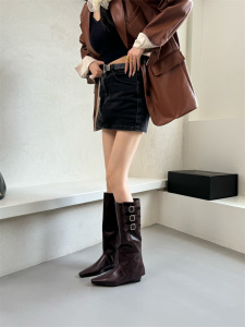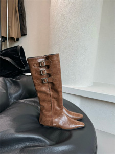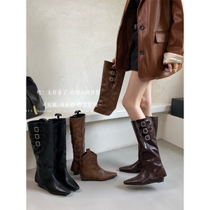棕色内增高尖头裤管靴长靴秋冬款复古两穿皮带扣马丁靴西部牛仔靴