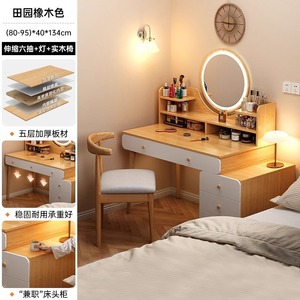 实木椅【五抽款+边柜+LED智能镜+实木梳妆椅】80-95cm田园橡木色出口品质