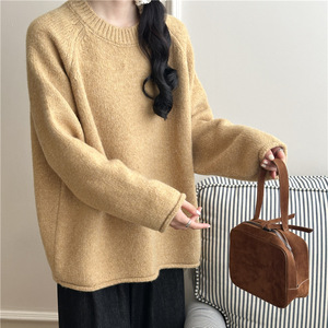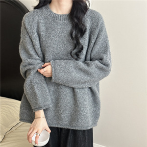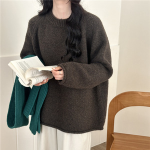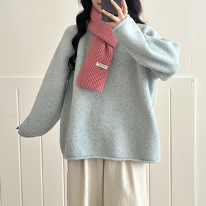 慵懒风温柔软糯卷边奶蓝色毛衣套头女宽松冬季加厚针织衫内搭上衣