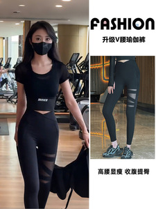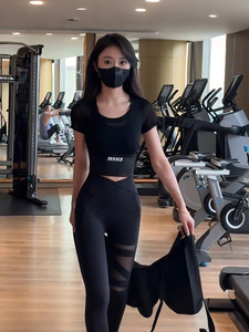 健身瑜伽服女夏季速干T恤大码胖MM修身显瘦运动上衣短袖长裤套装