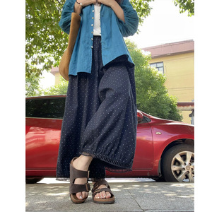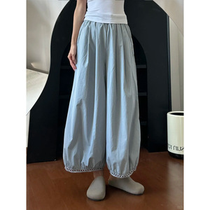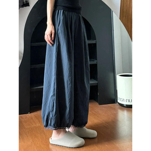 日系灯笼阔腿裤女夏薄款藏青色裤子大码胖显瘦小个子花苞九分裤