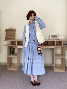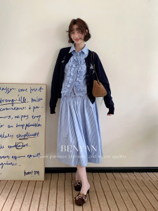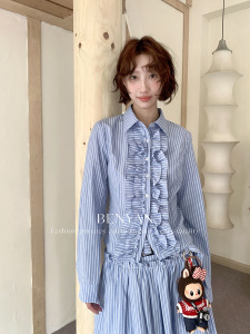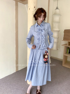 BENYAN本言 法式温柔风木耳边设计条纹衬衫半身裙两件套套装82275