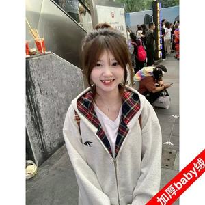 美式灰色连帽卫衣外套女秋冬新款宽松慵懒风撞色格子拼接拉链开衫