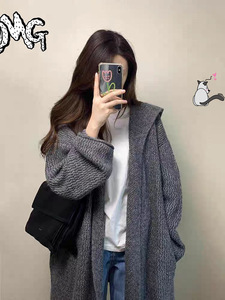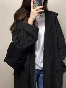 灰色中长款连帽毛衣外套女早秋季韩系气质宽松慵懒松弛感针织开衫