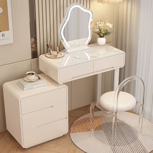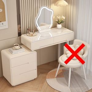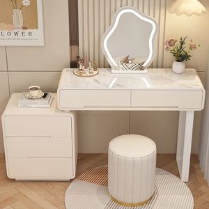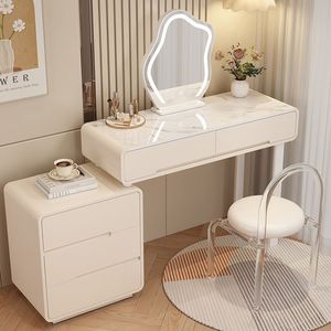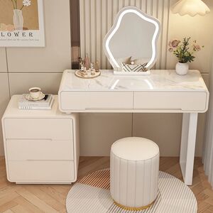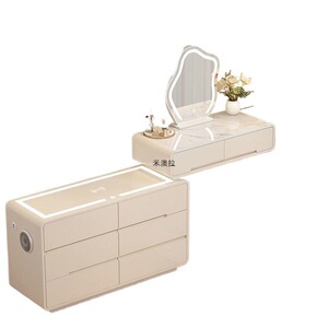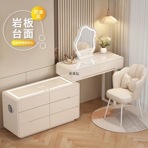 奶油风岩板家居卧室梳妆台床头一体式智能梳妆台ins风智能化妆桌