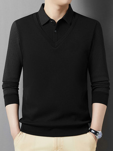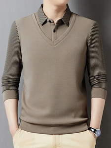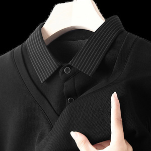 跨境2025男士长袖POLO衫秋季翻领T恤条纹假两件中年商务休闲上衣