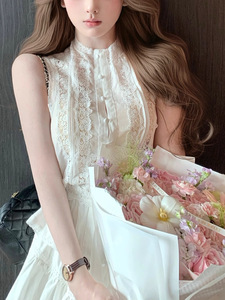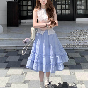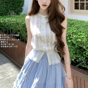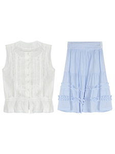 现货 白梨水 手工镂空天丝拼接天丝甜美上衣蓝条纹木耳边半裙套装