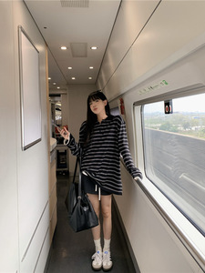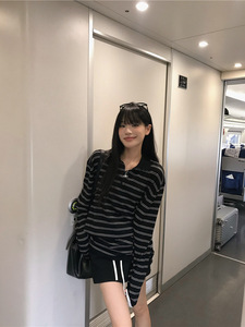 专属条纹撞色polo领长袖上衣女夏季新款韩系气质设计感百搭防晒衫