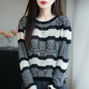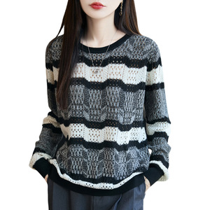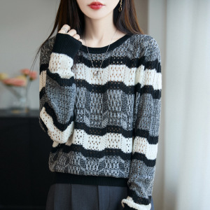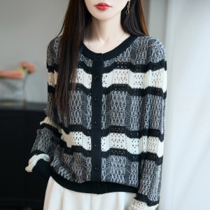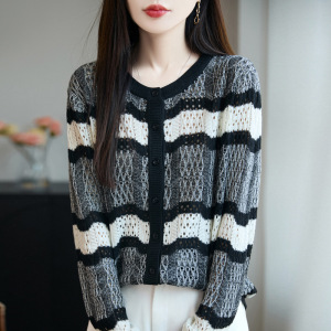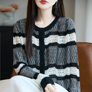 撞色精纺条纹镂空长袖针织衫开衫女毛衣2025新款显瘦外套上衣女装