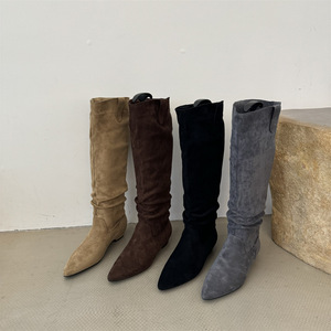 2025秋冬季尖头瘦瘦中筒长靴子粗跟复古绒面堆堆靴长筒骑士靴女鞋