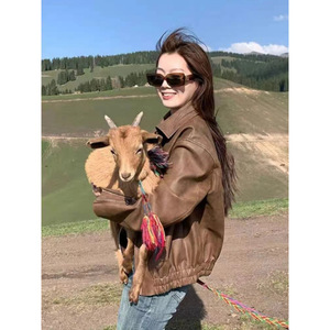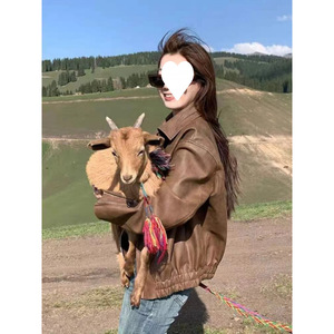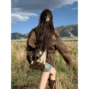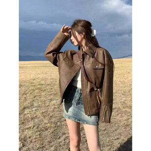2025复古棕色皮衣外套女秋美式复古夹克高级感上衣