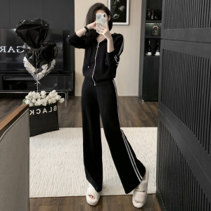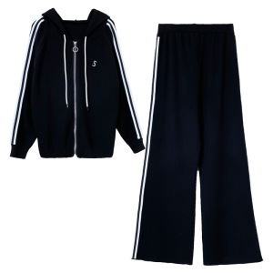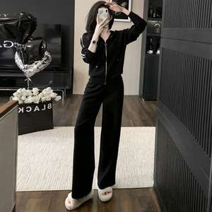 黑色运动连帽套装女装秋冬新款长袖拉链数字外套阔腿裤两件套