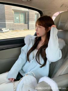 25春款连帽短款美拉德针织开衫网红同款小个子狐狸毛领皮草外套女
