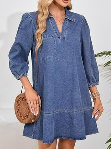 亚马逊2025新款欧美跨境女装休闲娃娃装V领七分泡泡袖牛仔连衣裙