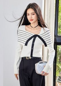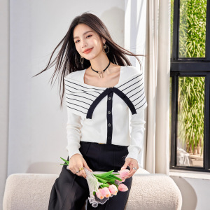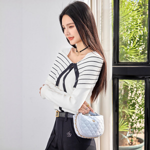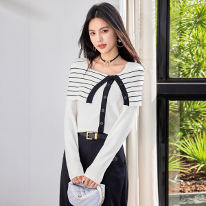 温柔风法式条纹针织衫女早春新款别致绝美修身气质长袖蝴蝶结上衣
