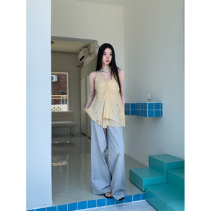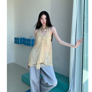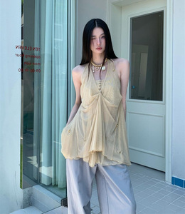 浅卡其网纱抹胸挂脖吊坠两件套温柔感吊带上衣