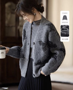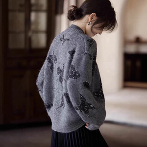 韩版秋冬季新款 羊驼珠片纱蝴蝶结提花 毛衣女外套小香风针织开衫