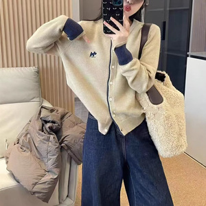 韩版新款跨境显瘦百搭撞色设计刺绣狗拼色袖针织开衫毛衣针织开衫