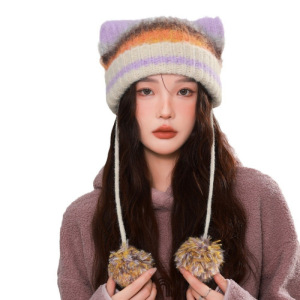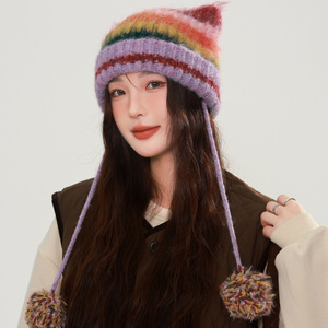 韩国小众复古毛绒条纹针织帽子女秋冬保暖护耳帽手工多巴胺毛线帽