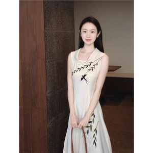 新中式国风荡领白色无袖背心连衣裙女夏季气质高级感收腰印花长裙