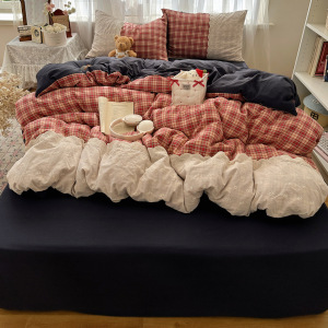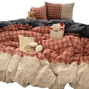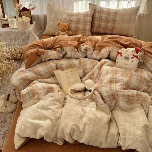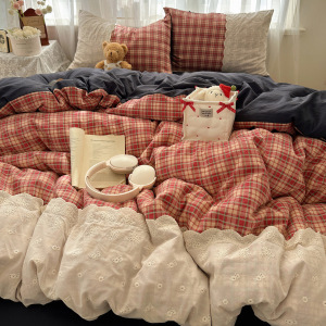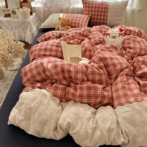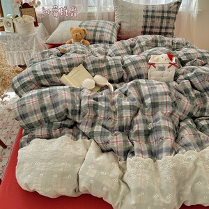 ins复古格子四件套蕾丝花边皱皱纱水洗棉被套宿舍床上三件套床单