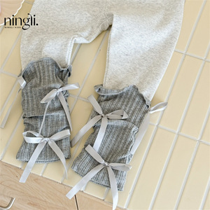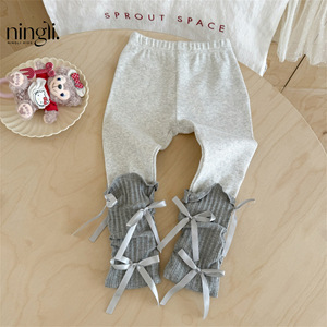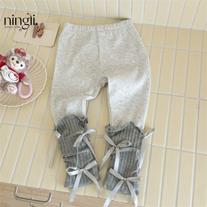 柠里女童打底裤秋季新款拼接裤子甜美韩系百搭蝴蝶结宝宝打底裤子