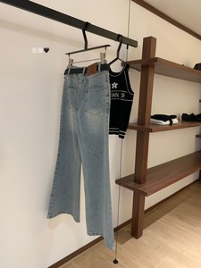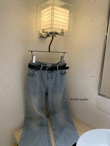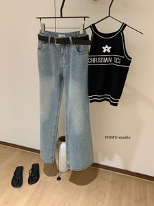 WGWE6828#水洗磨白猫须牛仔裤女休闲百搭阔腿裤牛仔裤(配腰带)