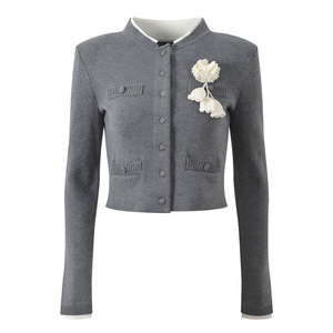 2025秋季新款设计感胸前花朵装饰撞色时尚百搭圆领短款小众开衫
