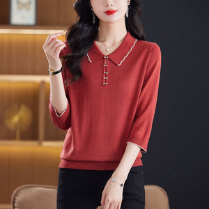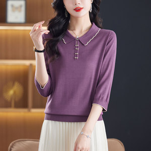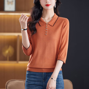 【厂家直供】翻领天丝七分袖上衣T恤女秋季新款宽松薄冰丝针织衫