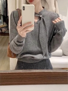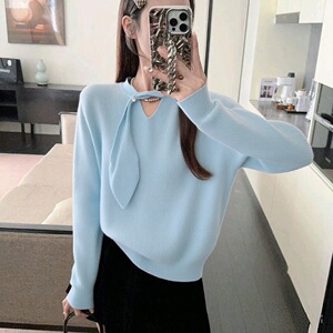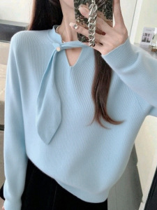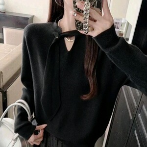 三股安迪绒飘带v领镂空毛衣女春秋内搭打底针织衫独特别致上衣潮