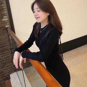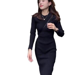 黑色圆领长袖连衣裙女2025秋冬新款修身内搭打底裙后开叉包臀裙子