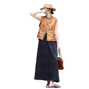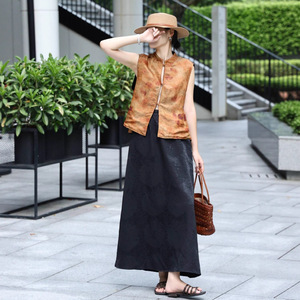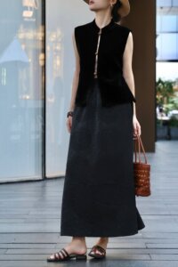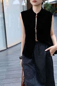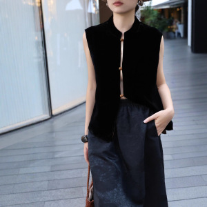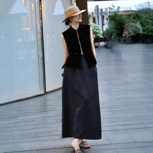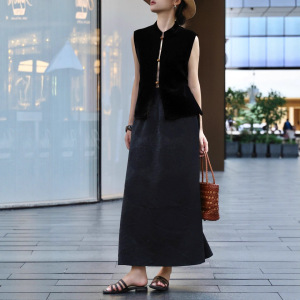 25新品新中式篙端套装设计两面可穿真丝绒拼接香云纱马甲+半身裙