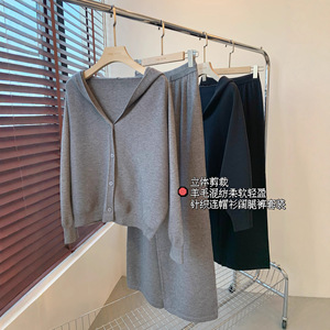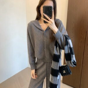 朵妮DN 立体剪裁 羊毛混纺柔软轻盈宽松落肩针织连帽衫阔腿裤套装