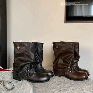 牛皮版~真皮时髦辣妹废土风西部短靴女秋冬扣带褶皱裤管靴马丁靴