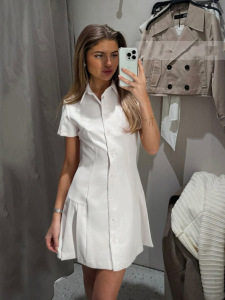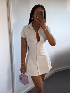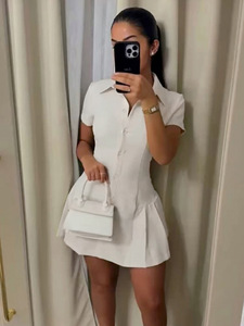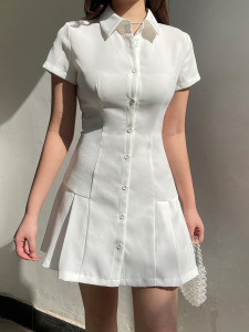 美式POLO领纯色气质排扣褶皱收腰显瘦衬衫A字短款连衣裙2025新款