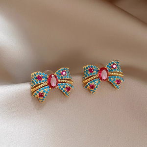 彩色重工精致蝴蝶结耳饰女2025新款高级感复古镶钻耳钉耳环