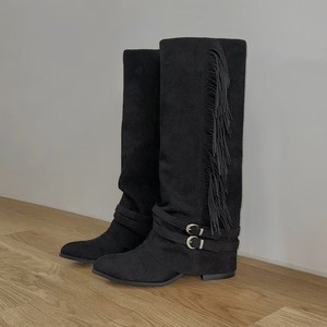 羊皮版~法式复古粗跟秋冬流苏靴长筒靴子25新款外贸大码女靴棕色