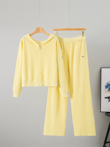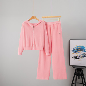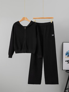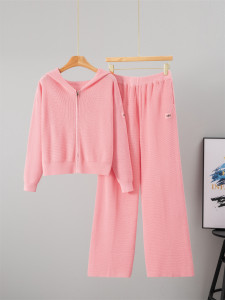 跨境欧洲站新款运动针织套装女秋冬连帽字母拉链开衫阔腿裤两件套